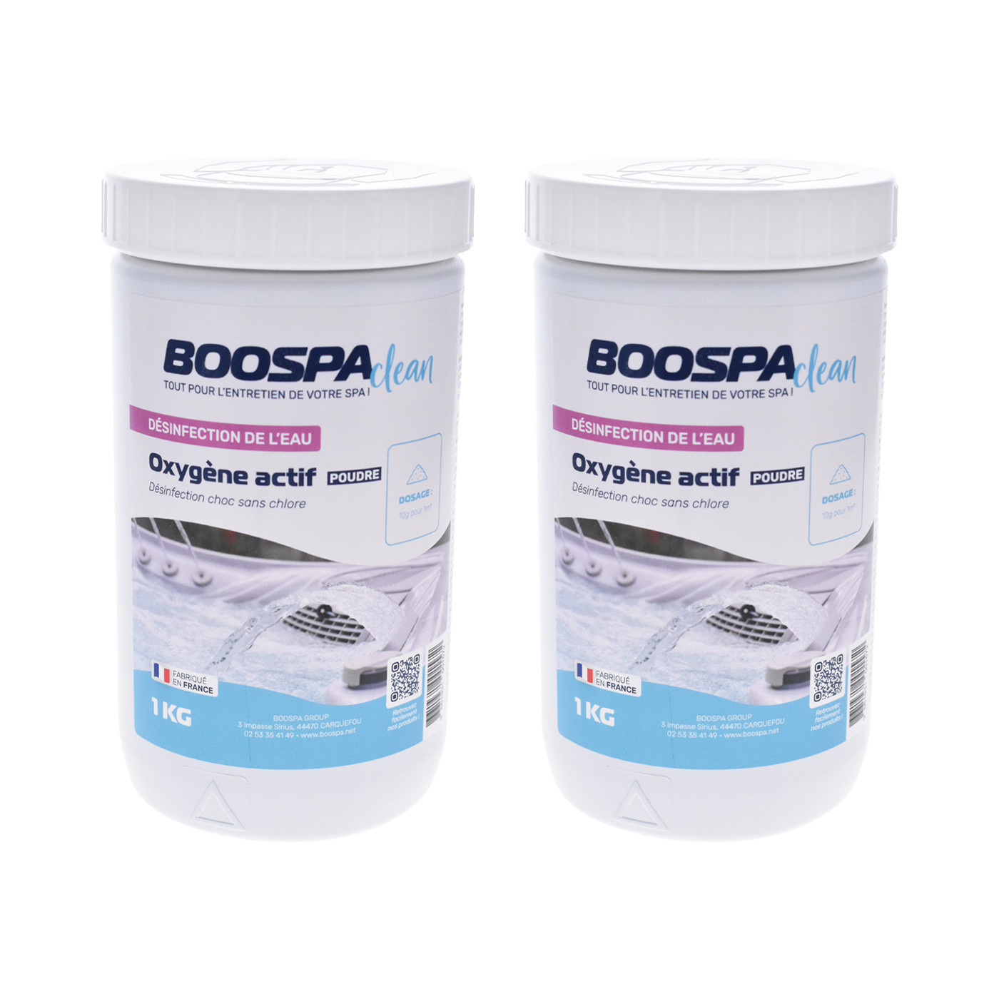 Boospa offers its BoospaClean Active Oxygen in powder form, packaged in 1 kg containers. Active oxygen is a powerful disinfectant ideal for chlorine-free shock treatment in spa water.